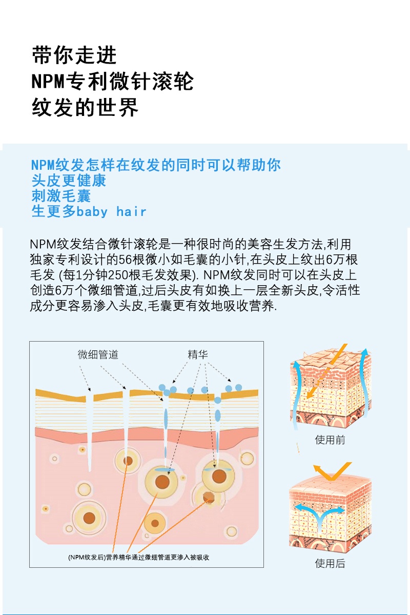 NPM亦是全球首个将“滚轮技术(roller technique)”应用于头皮纹发(Scalp Micropigmentation, SMP)的先锋品牌。
